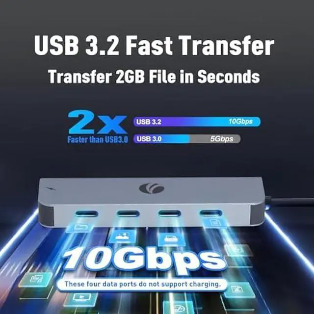 10Gbps Data TransferUSB C splitter move files to and from your laptop at speeds of up to 10 Gbps via the USB-C data ports. Thats fast enough to transfer a 20 GB file in just 16.4 seconds. We recommend connecting one or 2 external USB hard drive, SSD drives at a time.