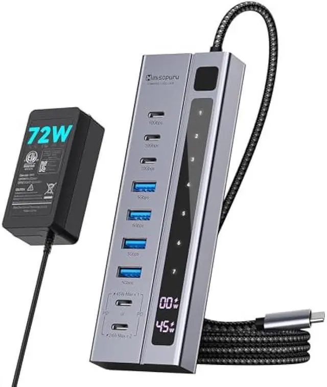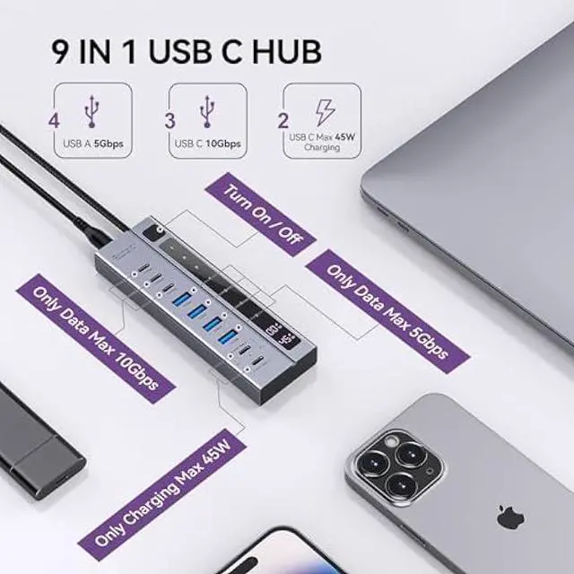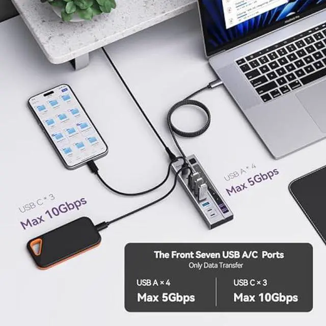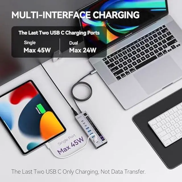 USB C Hub: The Powered USB Hub is equipped with 2* USBC (Single-Max 45W, Dual-Max 24W) charging ports, 4*USBA 3.0 data ports 5Gbps and 3*USBC 3.2 data ports 10Gbps.