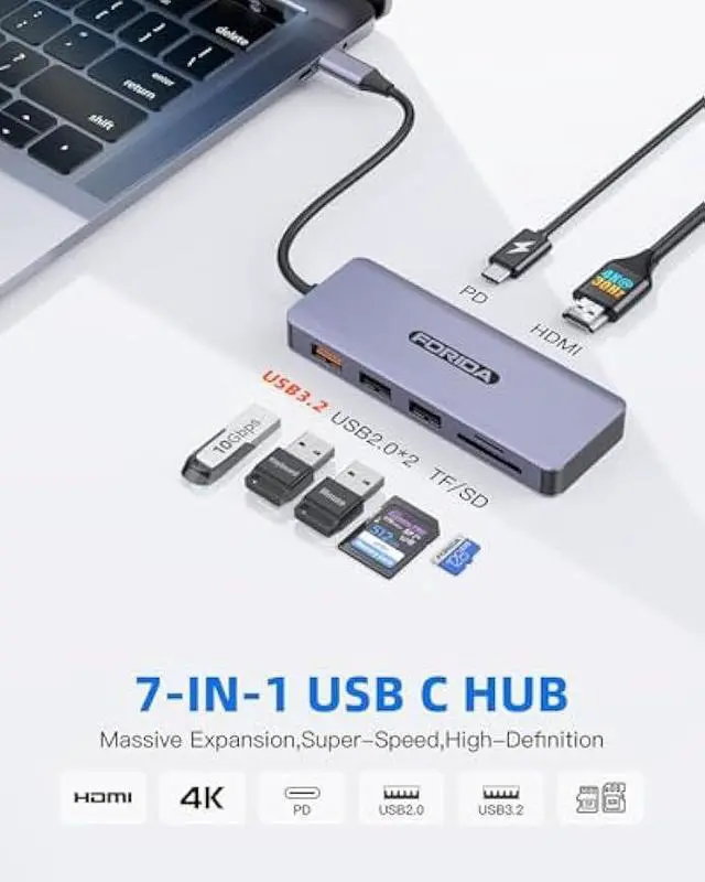 Plug and playFORIDA 7 in 1 usb c to hdmi hub breaking the limit of computer interfaces, Instantly turn your laptop, tablet and phones single usb-c port into a 4K hdmi; 100W Pd; USB 3.2 port. No additional driver required