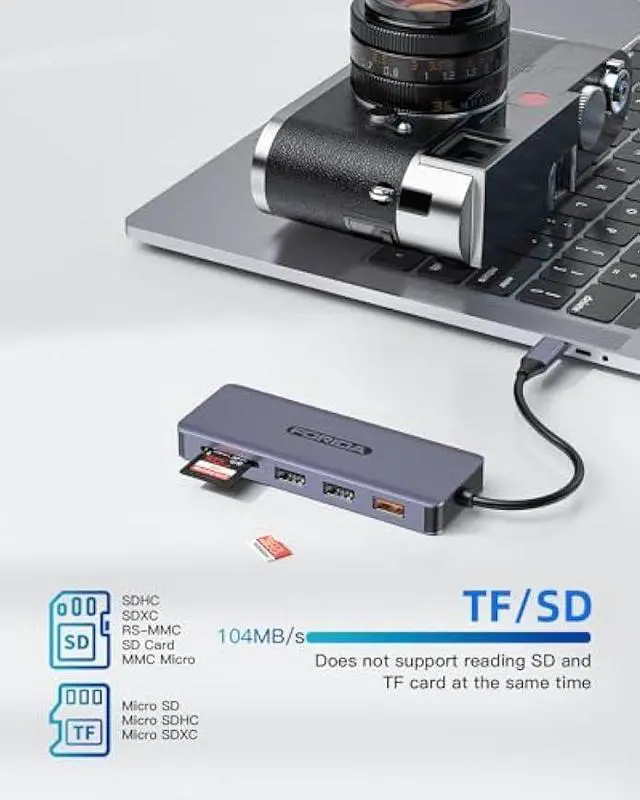High speed card readerThe SD & Micro SD dual SD 3.0 card reader with data transfer speed up to 104 Mbps. But our usb c hub does not support reading Sd and Tf cards at the same time