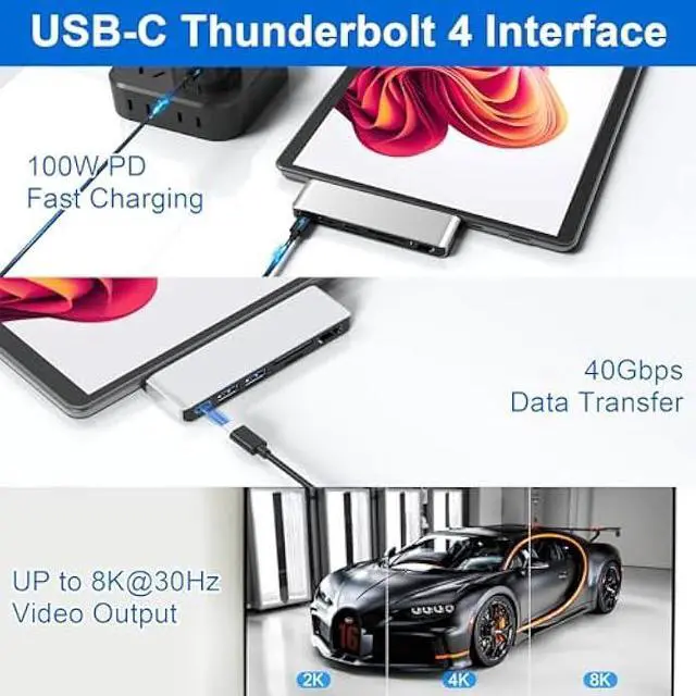 Designed for Surface Pro 9/Pro 10/Pro 11/Pro X - Our surface pro 11 hub is designed for Microsoft Surface Pro 9/10/11/X with multi-functional ports: 1*USB-C Thunderbolt 4 (8K@30Hz video display + 40Gbps data transfer + 100W PD charging), 1x 4K@30Hz HDMI port, 2 USB 3.0 ports, 1 SD card slot, 1 TF (Micro