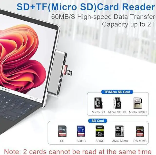 Stable and Fast Data Transfer - Surface Pro 9/Pro 10/Pro 11/Pro X usb c adapter has three ports to support data transfer: Type C Thunderbolt 4 supports 40Gbps data transfer, 2*USB 3.0 ports with transfer rates up to 5Gbps, and a built-in SD/TF (Micro SD) slot for easy access to files on SD/TF memory cards with ultra-high speeds of up to 60MB/S, with supporting up to 2TB memory reading. Compatible with SD, SDHC, SDXC, MIMC Micro, RS-MMC, Micro SD, Micro SDHC, Micro SD XC cards.