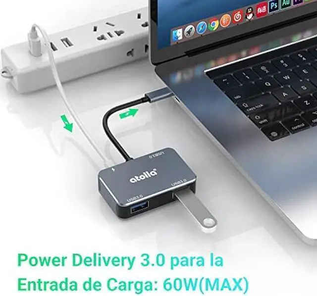 4 in 1 USB C HUBThis USB C hub with 1* PD 3.0 port and 3*USB 3.0 ports, connects to USB devices, like keyboards, mice, hard drives, and others, while powering for your laptop at the same time, perfect extension for laptops with USB-C or Thunderbolt 3 ports.