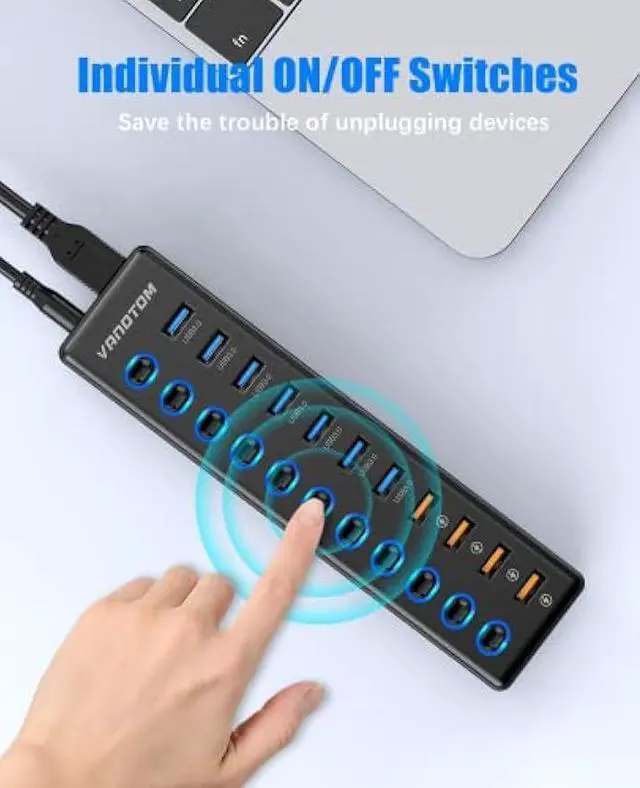 Powered USB Hub 3.0, VANOTOM 11-Port USB Hub Splitter (7 USB 3.0 Data Ports + 4 Smart Charging Port) with 12V/3A Power Adapter and LED Individual On/Off Switches for Laptop and PC
