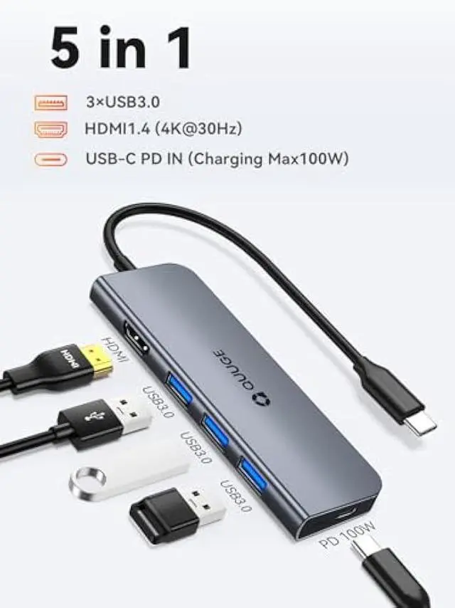 USB-C Hub: Features one 4K HDMI port, three 5 Gbps USB-A ports, and one USB C 100W PD-IN port.