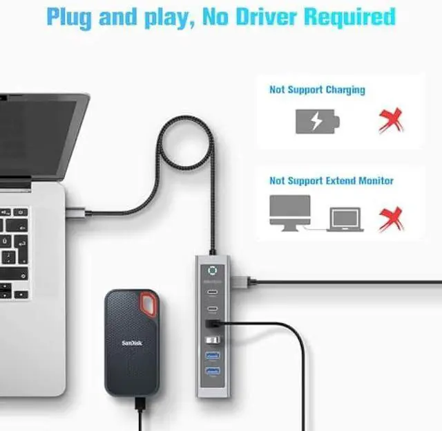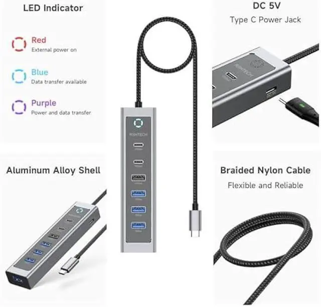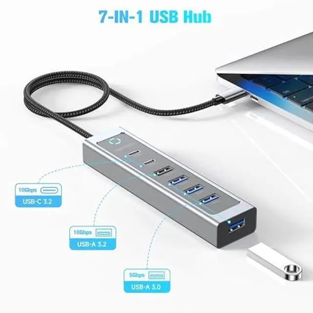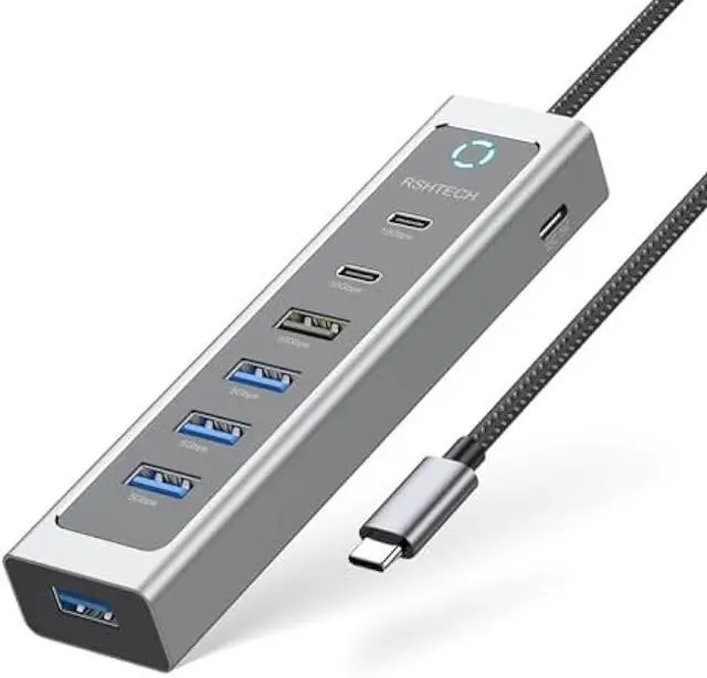 Hybrid USB Port Expander: RSHTECH 7 Ports USB 3.2 / 3.0 Hub instantly adds 1x10Gbps USB-A 3.2 port, 2x 10Gbps USB-C 3.2 ports, and 4x 5Gbps USB-A 3.0 Ports extensions to your laptop, PC and more. Plug-and-play, no driver required. The USB-C ports does NOT support video output or charging