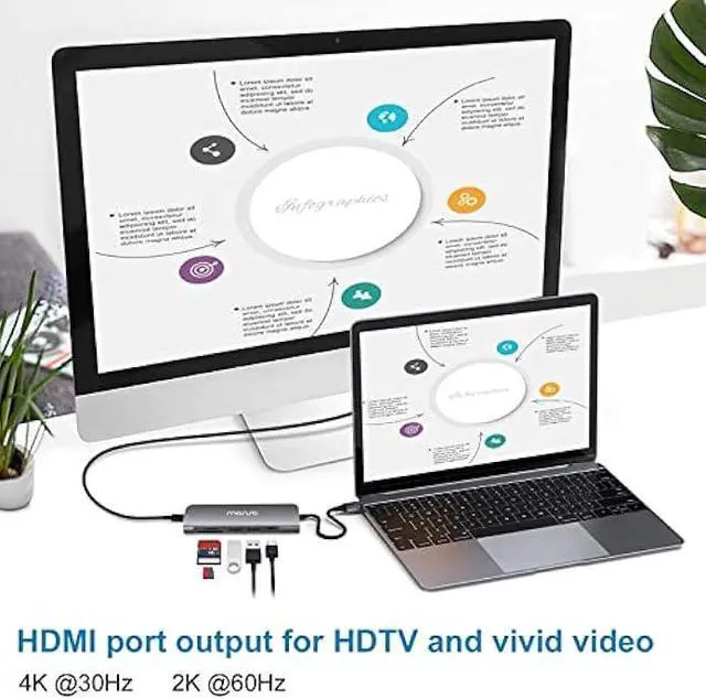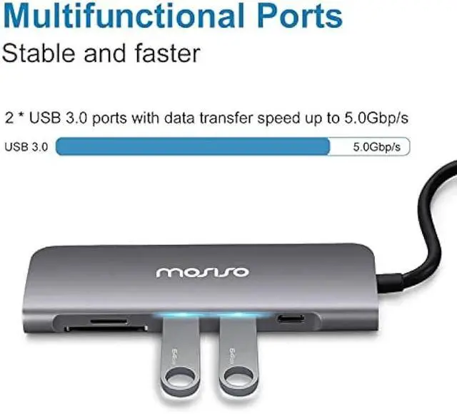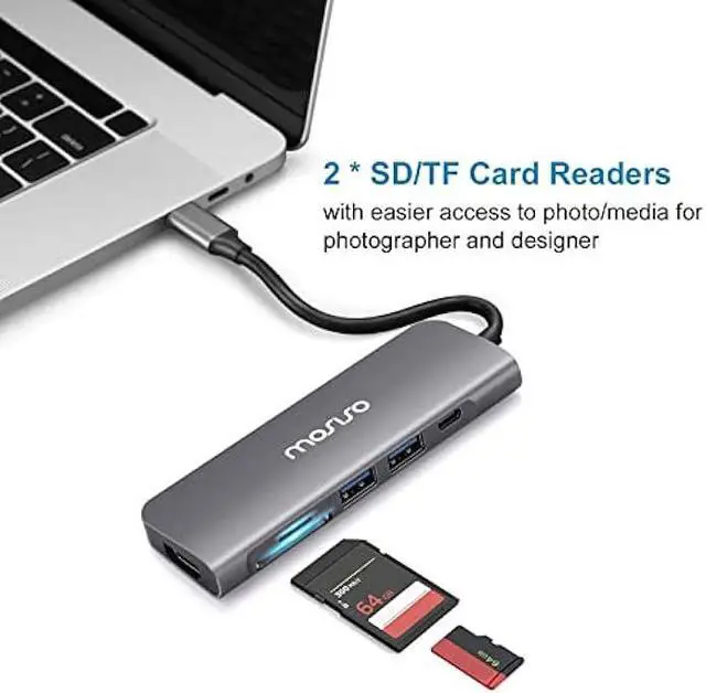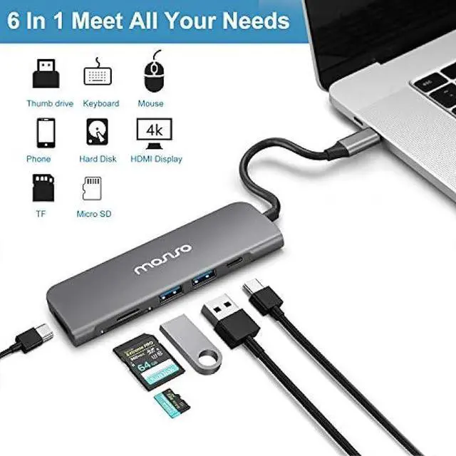 Compact dimension: 4.69 x 1.38 x 0.5 inch with 0.33 ft OTG cable. Our USB-C hub is of versatile function. 6in1 multiport: 1 USB-C charging port with 65W power delivery for your phone/tablet; 2 USB 3.0 ports with data transfer speed up to 5.0G bps for standard USB-A device, such as mouse, keyboard, SSD, flash; 2 SD/TF card readers with easier access to photo/media for photographer and designer; 1 HDMI port with 4K@30Hz/2K@60Hz output for HDTV and vivid video.