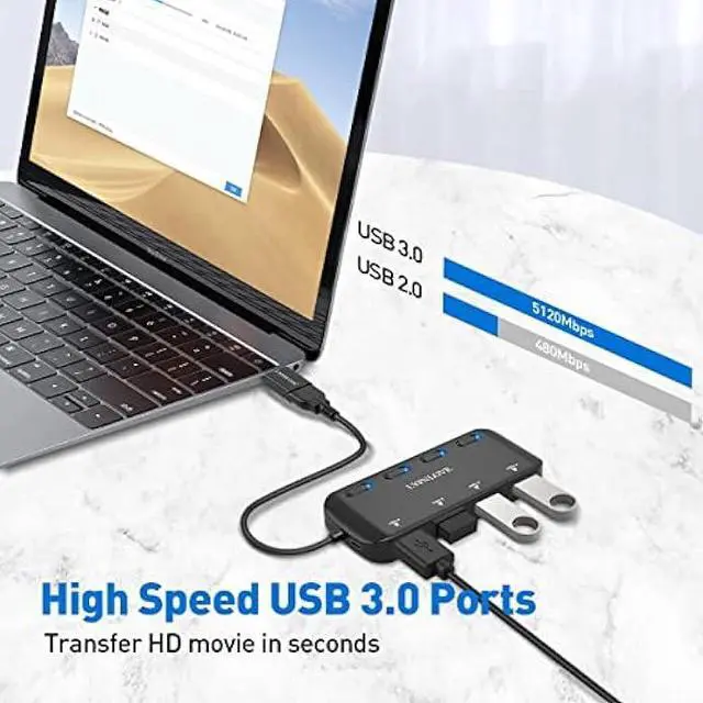 USB 3.0 Super Speed: Extra 4 USB 3.0 ports provide data transfer speeds up to 5Gbps, fast enough to transfer an HD movie in seconds, enjoy fast connection with this usb hub for laptop.