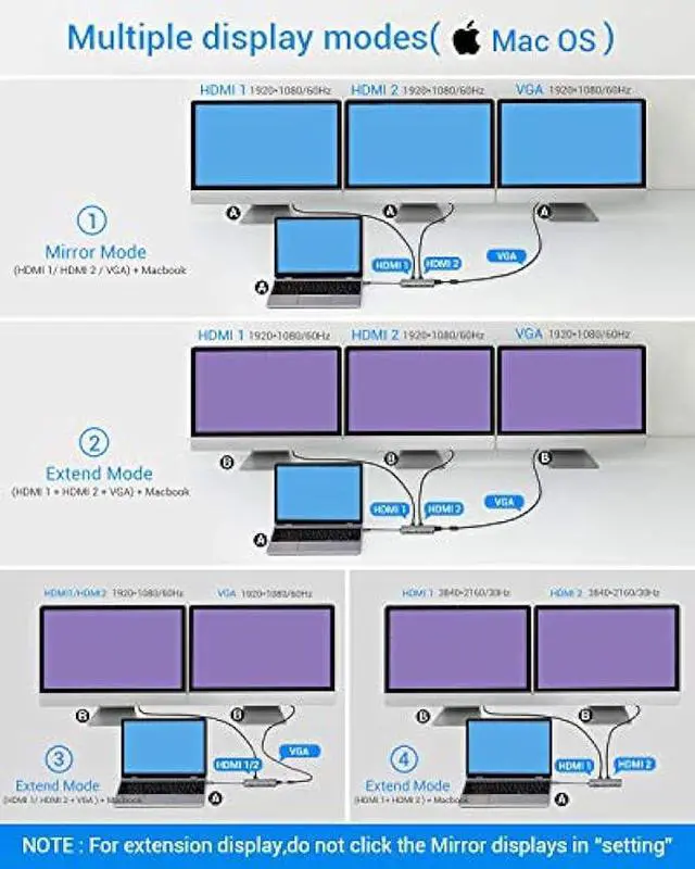 Mirror/Non-Mirror Mode on Mac Os system: MAC OS system does not support MST. You can enjoy one private display content on your laptop and share all external monitors with another display content. Dual HDMI supports up to 4K(3840x2160@30Hz)on MAC OS system. The resolution is 1920x1080@60Hz when using VGA.