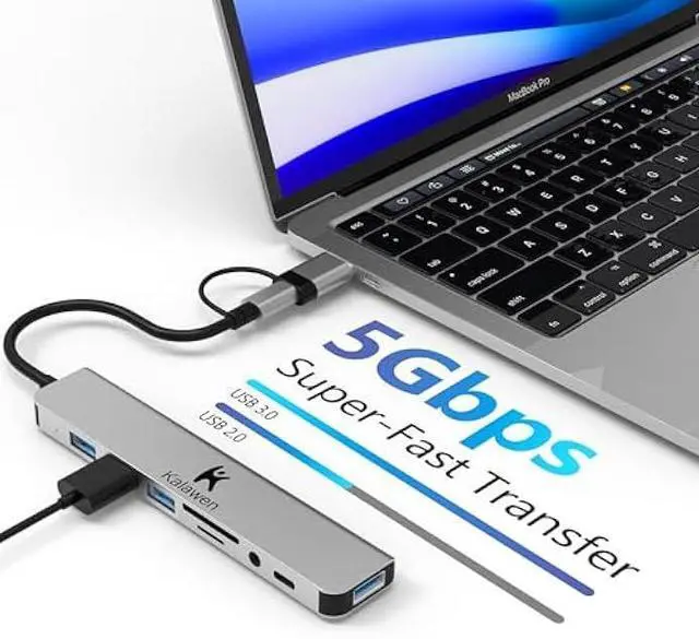 • 8 in 1 Multi-functional Hub: Kalawen USB C to USB 3.0 hub features 1 x USB 3.0 port, 3 x USB 2.0 ports, 1 x USB C 2.0 port, SD/TF Card Reader, and 1 x 3.5mm Audio Jack. With USB 3.0 offering a transfer speed of 5Gb/s, and USB and USB-C 2.0 providing a 480bps transfer speed, you can swiftly transfer and download videos, music, photos, and other files.
