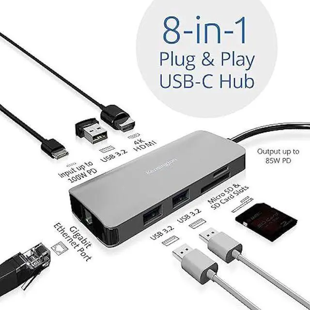 Supports up to 85W poUSB C hub With HDMI - USB-C driverless solution, no need to download, install, or update software this USB-C plug-andplay solution provides eight ports of connectivitywer pass-through, use your USB-C power supply to quickly and easily charge any USB-C enabled laptop (laptop must support Power Delivery). Optional Kensington 100W Power Adapter (K33821) sold separately