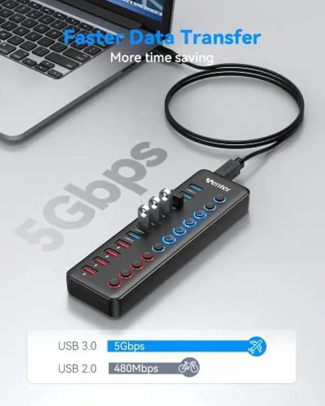 Individual On/Off Switches: USB hub powered is designed with individual on/off switches, you can turn the power on and off whenever you choose without unplugging the equipment. Besides, Each port includes an LED light so you can check the power status.