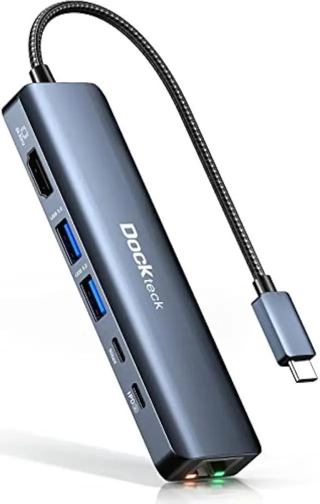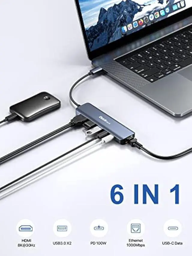 USB C Multiport Adapter 6 in 1: The USB-C dock features an 8K HDMI output port, USB-C 5Gbps data port, USB-C 100W PD charging port, 1Gpbs Ethernet port and two USB-A 3.0 ports. This stylish aluminum slim USB C adapter allows you to convert your laptop into a workstation no matter where you are
