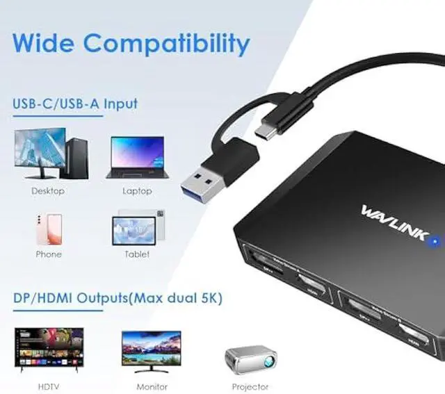 CompatibilityWork with Windows 7/8/ 8.1 /10/11, MacOS 10.14 -13. x or later, Chrome OS, Android, Ubuntu and HarmonyOS. NOT Compatible with Linux, Unix, iPad OS & iOS. Please note that driver installation is required, do not support plug and play! Please visit the website 'displaylink. com' to download the latest driver.