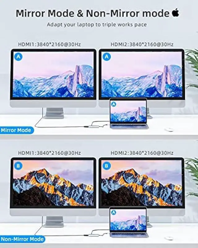 • [Crystal Clear Video Output]: This Type C to dual HDMI adapter supports an ultra HD output with 4K@30Hz resolution and dual-output with both 1080p@60Hz for Windows laptops. For Apple laptops, the external display will always stay at 4K@30Hz in mirror and non-mirror modes.