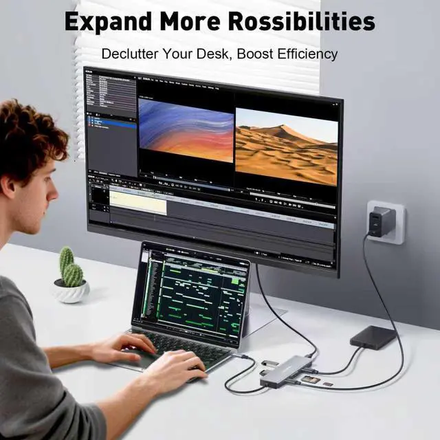 Efficient power supply without interruptionIntegrated USB-C PD 3.0 charging port supports 100W high power pass-through charging, which can quickly replenish energy for MacBook Pro, XPS and other devices, and at the same time provide power supply for external hard disk, keyboard and mouse, etc., to solve the anxiety of power consumption of multiple devices. Intelligent shunt technology ensures stable charging, even when running at full capacity, it does not affect the performance of other ports, truly realizing use while charging.