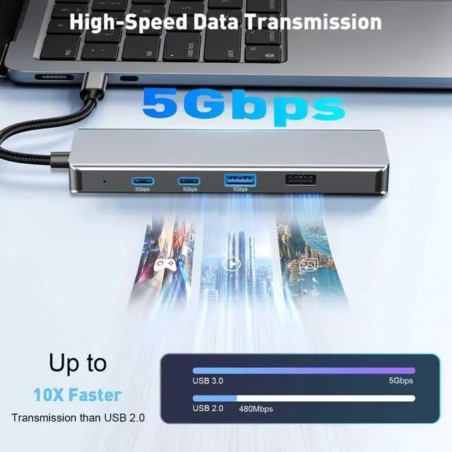Multi-Function Docking StationThis USB C Hub integrates 9 useful ports, which perfectly solves the problem of interface shortage. Includes 4K@60Hz HDMI video output, two 5Gbps USB-C 3.1 data ports, one 5Gbps USB-A 3.0 port, two 480Mbps USB-A 2.0 ports, 100W PD fast-charging port, and a dual SD/TF card slot (104Mbps transfer), adapting to multiple scenarios of office, entertainment, and creativity, making it a laptop, Tablet and other devices