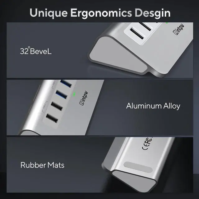 Aluminum Ergonomic Design: Different from other usb c hub' s plastic materials, this powered usb hub with aluminum unibody provides premium protection with a slick look and a better heat dissipation. Temperature control under 45, keep all the USB ports safe and stable during operation. Ergonomics 32-degree angle and rubber mats, saving more effort when you plug and unplug your USB devices and placing more stability on your desk. Appearance also is unique, fashionable and modern.