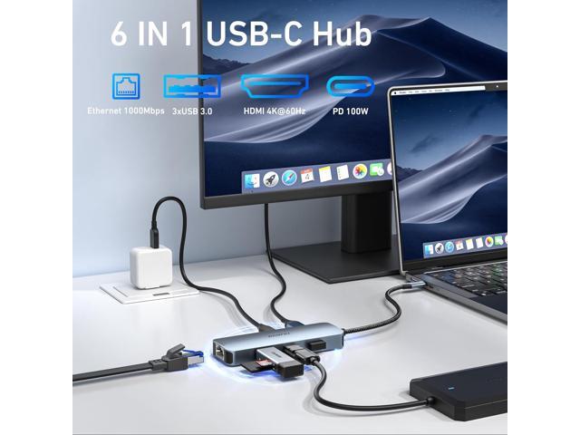 BENFEI USB C HUB 6-in-1 with HDMI(4K@60Hz), Gigabit Ethernet, 100W Power Delivery, 3*USB 3.0, Silicone Cable, Aluminum Case Compatible with iPhone 15 Pro/Max, MacBook, iPad Pro, iMac, S23, XPS17