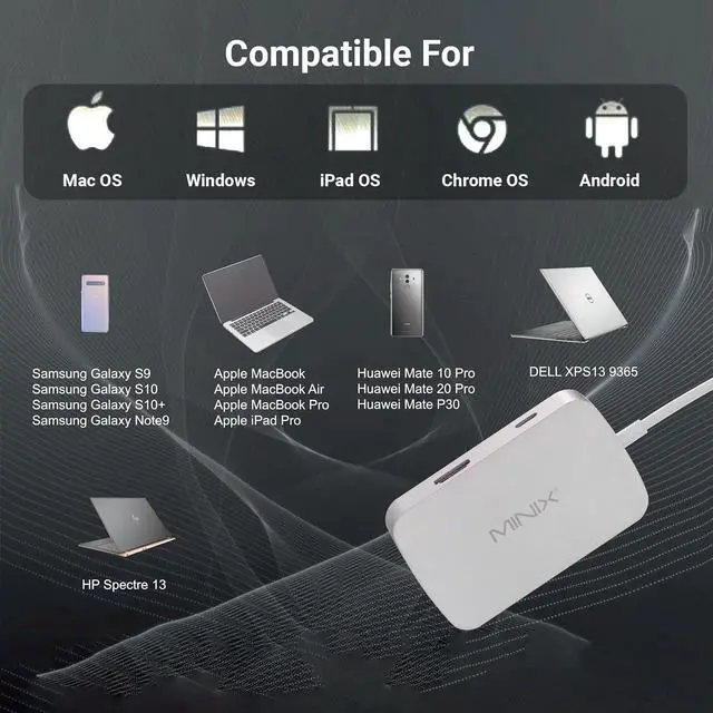 Universal Compatibility: MINIX macbook hdmi adapter Supports MacBook Pro/Air Ipad, usb hub for laptop and More. Please note, it is important to verify your device supports display output, power input and data transfer via USB-C to ensure compatibility with the adapter