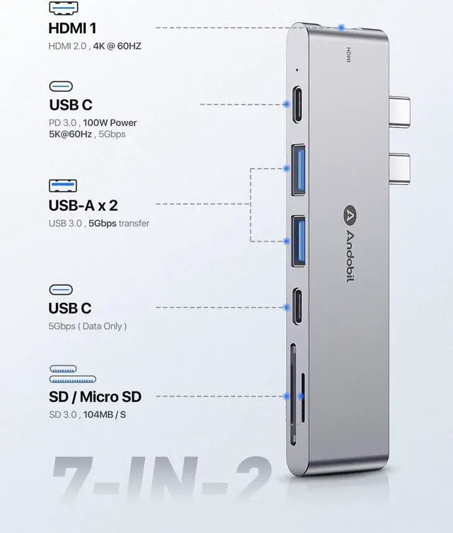 • [ Perfect Business Adapter Style & Handheld Size ]: Andobil is the Best MacBook Pro/Air USB c hub. Expand your MacBooks 2 USB-C ports into 1 Thunderbolt 3 (100W Power Delivery), 1 USB-C data port, 2 USB-A ports, 1 HDMI port, 1 SD card slot, and 1 microSD card slot.