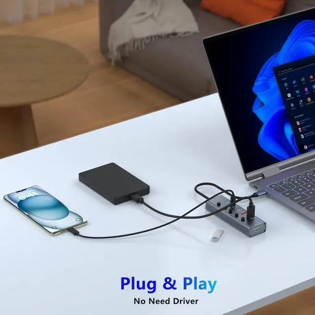 Sturdy Design & Individual SwitchesThe usb-c splitter boasts a high-quality aluminum housing with a sleek, glossy edge design that is both durable and visually appealing. Each port of the USB C hub has an individual switch with an LED light. With this USB 3.2 gen 2 hub, you can easily connect and disconnect devices by pressing the power button for one second.