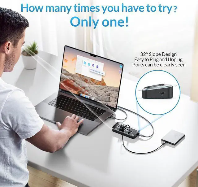 Excellent DesignThe SETMSPACE USB C Hub for pc features a 32° ergonomic design to mitigate damage to the product' s USB ports from plugging and unplugging, and the hub' s 32° angled design greatly enhances the consumer experience and extends the life of the product compared to the flat design. This USB C hub allows 10k continuous plugging and unplugging tests.