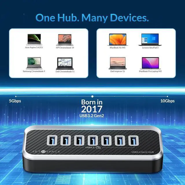 10Gbps SETMSPACE Ultra Slim USB 3.2 Gen 2 USB C Hub quipped with 10Gbps transfer speed. Welcome everyone' s test after buying. We have a worry-free 12-month warranty and friendly customer service.