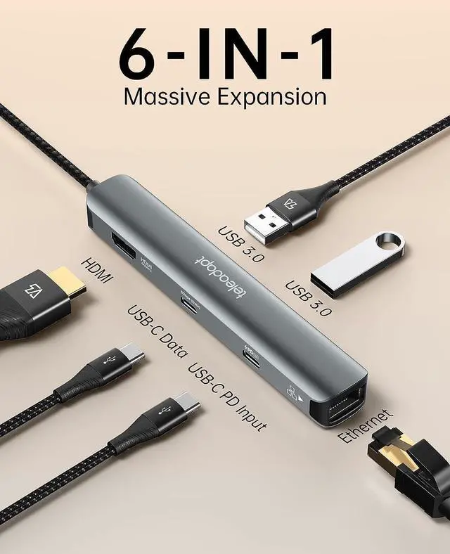 Design: USB Type-C 6-in-1 hub with HDMI, 2xUSB-A, RJ45, USB Type-C data and USB Type-C PD female ports. Provides an ideal solution for adding ports to a USB Type-C or Thunderbolt 3 host (PC/Laptop/Mobile Phone etc)