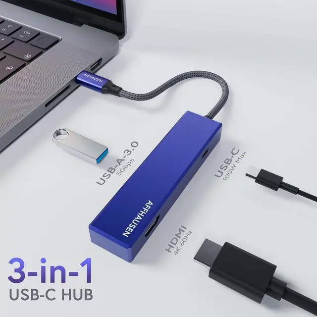 PORT TYPE C HUB: AFFHAUSEN 3 in 1 USB C Multiport Adapter expands your USB-C device' s functionality with a 4K HDMI port for high-definition video, a USB-C PD Pass-Through port, and a USB-A port for data transfer.