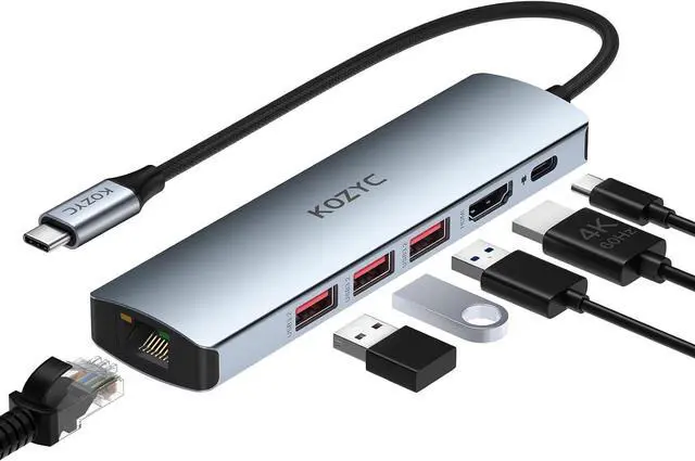 USB-C Hub EthernetKOZYC USB-C adapter features 1xHDMI 4K@60Hz, 3xUSB 3.2 ports, 1x Ethernet port, 1x100W PD charging, which is designed for expanding the devices with a Type-C port to getting additional connectivity options.