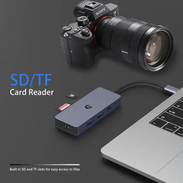 USB 3.0 USB C HUB & SD/TF-- The USB 3.0 port supports high speed data transmission up to 5Gbps. Access your files, music and movies in seconds. Compatible with SD and TF cards with capacities up to 2TB and data transfer speeds up to 104Mbps.
