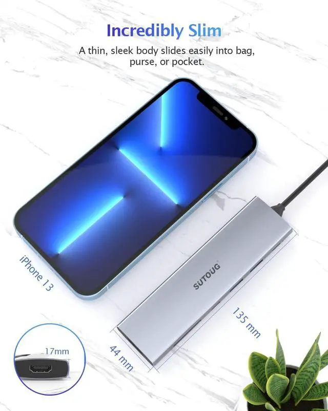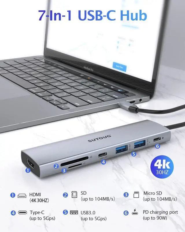 7 IN 1 Solution - The SUTOUG 7-in-1 USB-C hub featuring a USB C charging port with power delivery, a 4K/30Hz HDMI port, an SD card reader, a TF card reader, and 3 USB 3.0 Ports, allowing you to connect a keyboard, USB driver, or external Disk to the laptops.