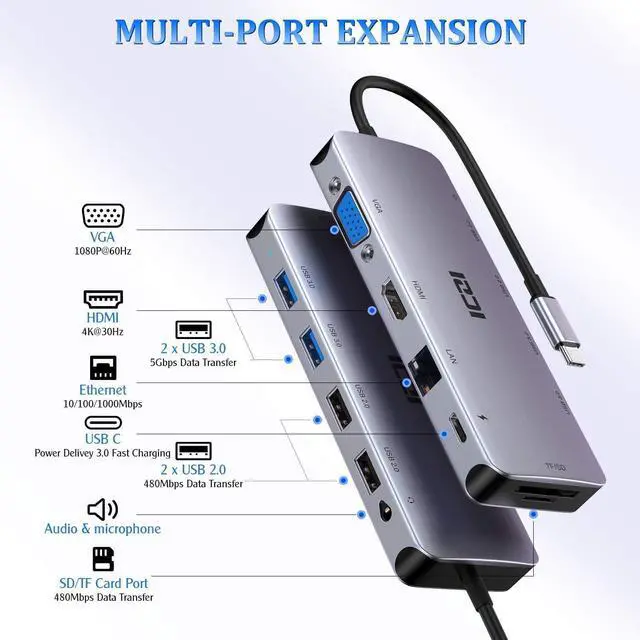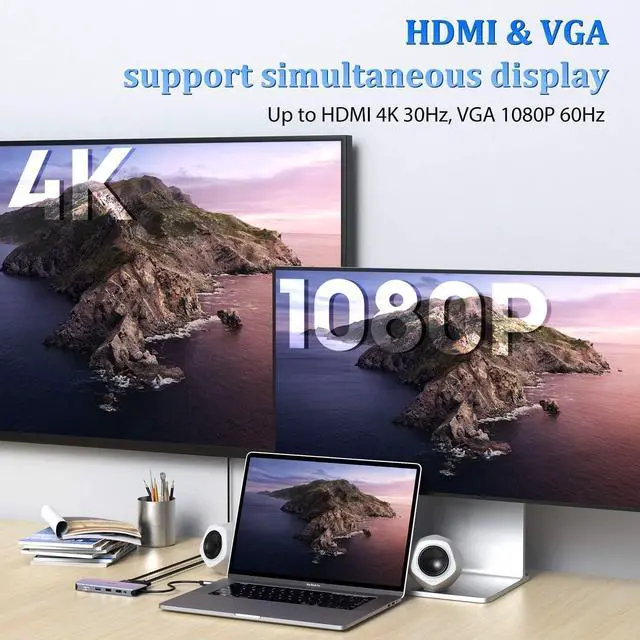Multifunction: The USB-C expansion hub transforms your computer' s single USB-C port into 11 distinct output ports, effectively meeting your basic needs for both work and entertainment. The hub features a 4K@30Hz HDMI port, a 1080P VGA port, an SD/TF card reader, a Gigabit Ethernet port, 100W PD charging, two USB 3.0 ports, two USB 2.0 ports, and an audio interface. (Note: When both HDMI and VGA are used simultaneously, the maximum resolution supported is 1080P. )