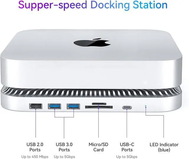 Mac Mini Dock 7-in-1 expansion PortsThe Mac mini docking station features an USB-C data port (up to 5 Gbps), 3 USB-A data ports (up to 5 Gbps), 1 USB 2.0 port, and micro/SD card reader for convenient access to all your essential peripherals.