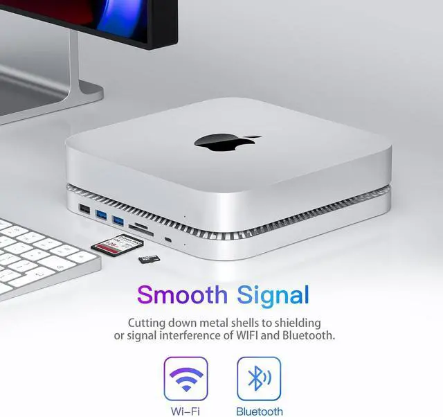Unique Design & Technical Innovation RayCue Mac Mini hub, with patented ventilation design & premium heat dispersing material, has good efficiency on heat dissipation, and at the same time, can cut down metal shells to shielding or signal interference of WIFI and Bluetooth.