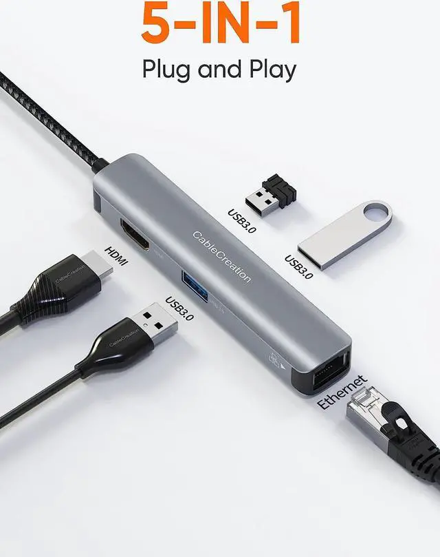 Play: This USB-C hub expands the USB C port of your Laptop/ Tablet/ Cellphone to HDMI port, Ethernet port, and 3 USB 3.0 Data ports. Equipped with 15cm flexible and durable nylon braided cable, the aluminum shell structure can effectively dissipate heat even when fully loaded. Ideal for traveling or working home.