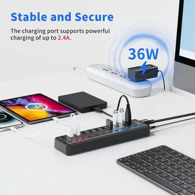 USB Hub: Features 7 USB 3.0 ports (up to 5Gbps) and 4 charging ports (up to 2.4A ), ideal for transferring data or charging multiple devices with a reliable 36W power adapter.