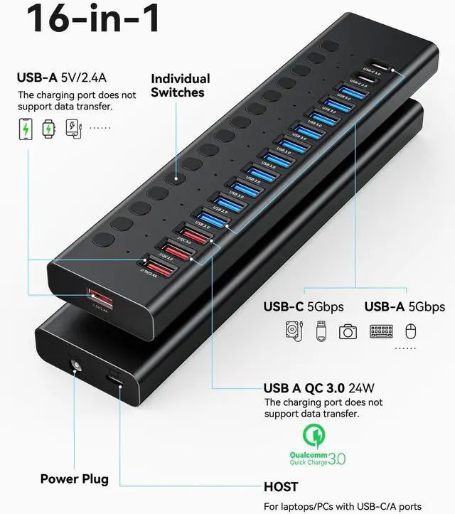 Hub: The AGEEN Powered USB Hub is equipped with 10 USB-A 3.0 ports, 2 Quick Charging (QC 3.0 ) ports, 2 USB-A Smart Charging ports, and 2 USB-C 3.0 data transfer ports. The QC 3.0 ports deliver 24W power, while the Smart Charging ports provide 5V/ 2.4A power, ideal for charging smartphones, tablets, earbuds, smartwatches, and other compatible devices.