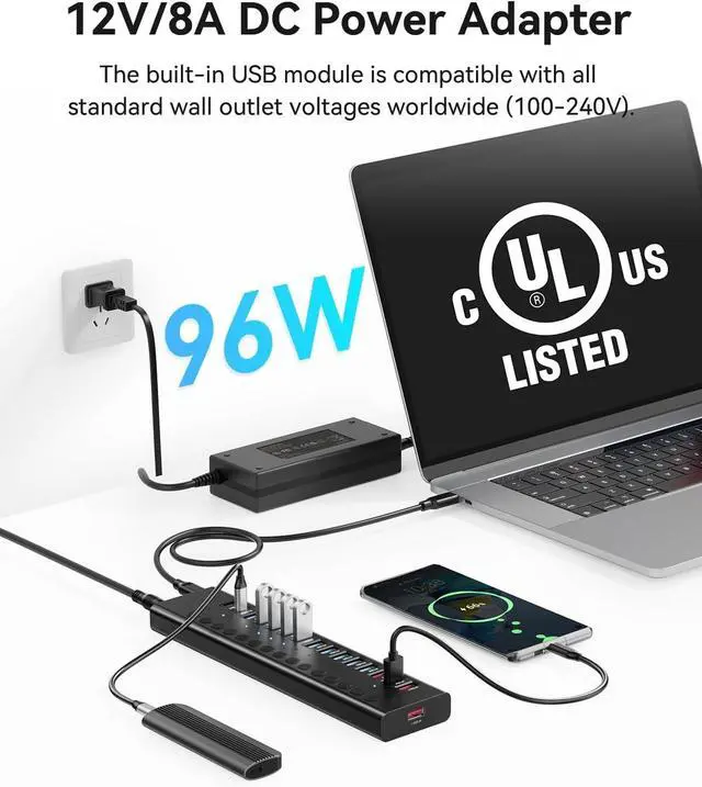 96W (12V/8A) UL-Certified Power Adapter: Unlike budget-friendly USB hubs with low power output, the AGEEN Powered USB Hub comes with a 96W UL-certified power adapter. It provides high-wattage output, fast charging capabilities, and support for charging multiple devices simultaneously, making it a reliable, convenient solution for powering and charging all your electronic devices.