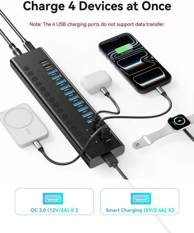 2× QC 3.0 (Quick Charging) Ports: Powered by Qualcomms advanced chipset, this Powered USB Hub features 2 independent QC 3.0 ports, each capable of supplying 24W power separately. Youll experience ultra-fast charging speeds, especially when your devices battery level is below 10%. Its unique 4-charging-interface design ensures the charging needs of multiple devices are met simultaneously without compromise.