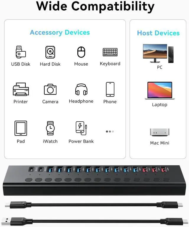 5Gbps High-Speed Data Transfer: This hub includes 10 USB-A 3.0 ports and 2 USB-C 3.0 ports, boasting data transfer speeds of up to 5Gbps-10 times faster than standard USB 2.0 hubs. Moreover, the USB 3.0 interface delivers a maximum power output of 5V/ 1.5A, sufficient for charging most USB-powered devices. You can transfer a full HD movie in just seconds, and it is backward compatible with USB 2.0 and USB 1.1 devices for versatile use.