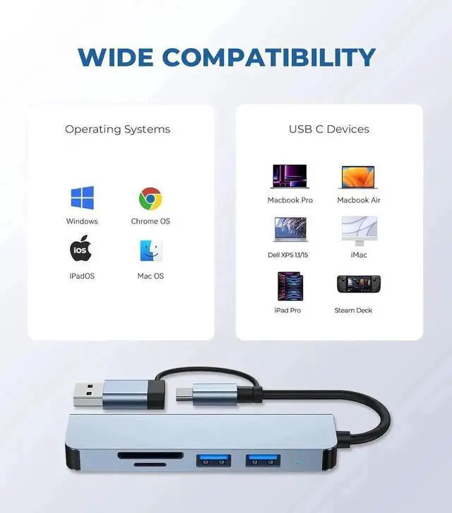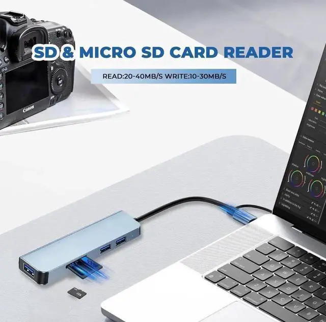 Multifunctional HUB: USB 3.0 hub with 5 interfaces: 1 USB 3.0 port, 2 USB 2.0 ports, SD/TF card readers. With this USB hub, you can extend one of your computer USB port into three, which means you can connect three USB peripherals simultaneously, such as keyboard, mouse, printer, USB disk and etc. And the other 2 slots are for your SD memory card and micro SD memory card.