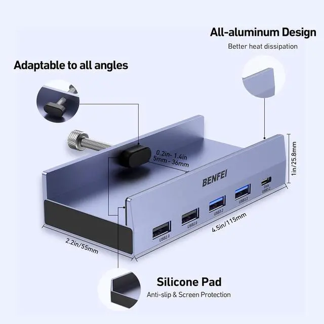 New Clampable Hub DesignBENFEI USB C Hub designed with adjustable screw allow you to mount monitor screen edge or desk edge thickness from 0.19 to 1.41 inches (5-36mm) without occupying much space and keeping your desk top neat. The fix Hub is easy installation and sturdy and rubber cover on the screw can protect monitor's finish. 4K@60HZ Vivid DisplayMirror or extend your laptop tablet or phone screen to external HDMI display up to 4K@60Hz keeping every incredible moment detailed and ultra vivid. Please note that the C port of the Host device needs to support video output.