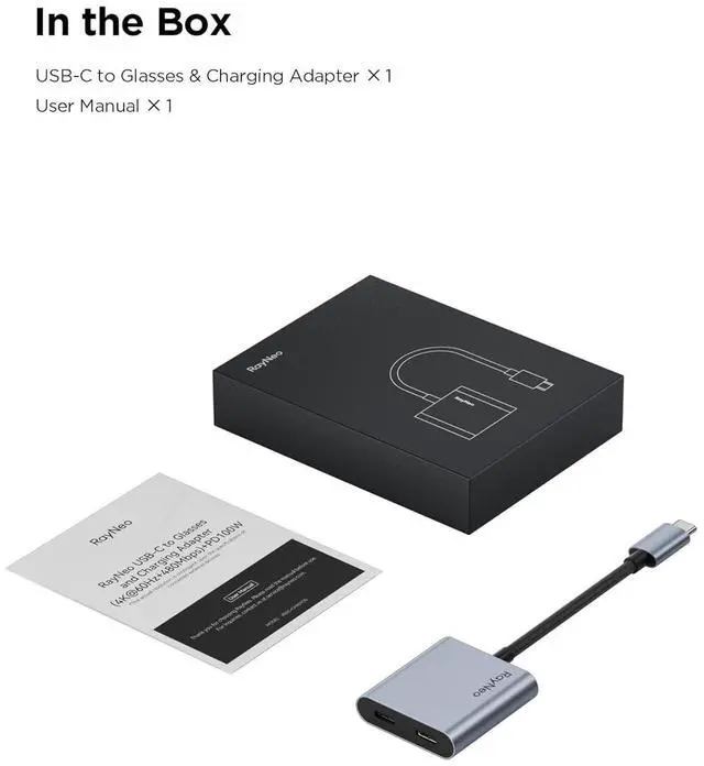[4K@60Hz Video Output + 100W Charging] Experience ultra-smooth 4K resolution at 60Hz for stunning visual clarityideal for gaming streaming or workingwhile simultaneously fast-charging your device at up to 100W[Wide Compatibility Across USB-C Devices] Works flawlessly with USB-C enabled devices that support DisplayPort Alt Mode including Nintendo Switch (Not for Switch 2) Steam Deck iPhone and Android smartphones tablets and more. Fully compatible with RayNeo smart glasses like Air 3s Air 2s and Air 2. [201 Cinematic Mega Screen] Transform your viewing experience with an ultra-immersive 201-inch virtual display. Perfect for enjoying movies games or binge-watching your favorite content with a theater-like feel.