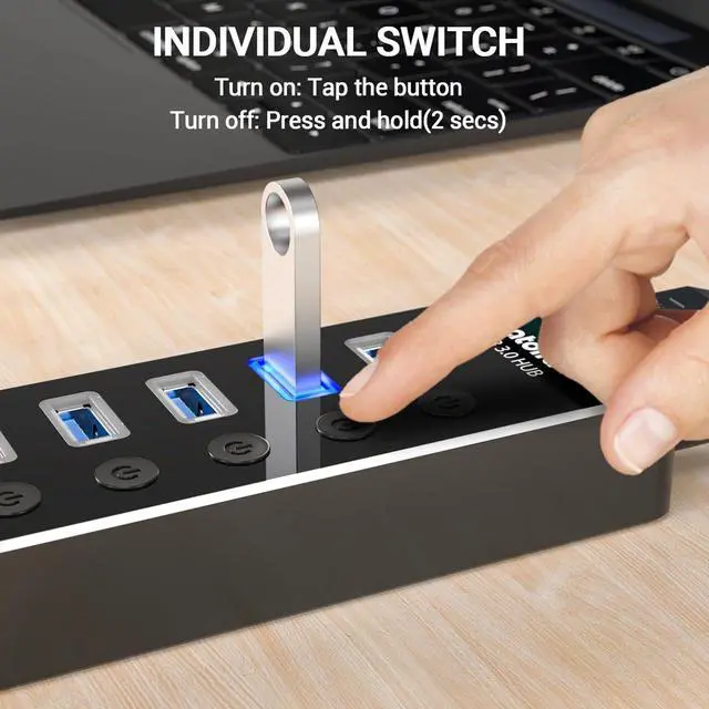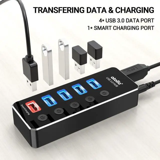 4 USB 3.0 Ports for High-speed Transmission- atolla USB hub can expand 4 USB 3.0 ports for your computer and transfer rates up to 5Gbps to allow data to move quickly between devices; it's backward compatible with your older USB 2.0 devices; plug and play without driver installationSmart Port for Synchronous Charging- The smart-charging port provides up to 2.4A mps powering your smartphone tablet and other USB-charged devices including Android and devicesIndividual Switch with LED- Each USB port on the USB 3.0 hub has an individual switch; you can turn off the USB ports that are not in use to save power without the hassle of unplugging and the LEDs on the USB port can indicate the ON/OFF status of each portMaximum Compatibility and Best Design- atolla 5-port USB hub is made of high-quality aluminum alloy and has an elegant design that fits naturally for home and workplaces; compatible with Windows 10 8.1 8 7 Vista XP Mac OS X (10.