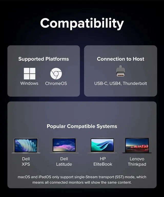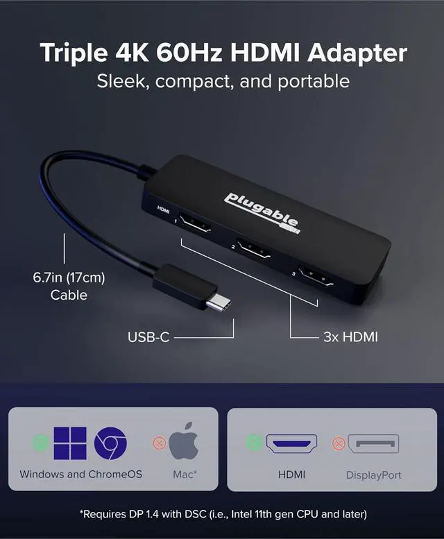 Glance: Connect up to 3x 4K displays through a single USB Type-C port. This plug and play USB C to HDMI adapter supports HDR and HDCP. Compact design fits perfectly in the office or on the goCompatibility: Works with Windows 10 or newer and ChromeOS 100 or newer on laptops that have a USB-C USB4 or Thunderbolt port with video output. Not recommended for