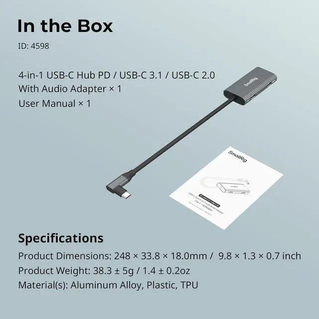 Hub Multiport: The SmallRig Hub 4598 provides a PD high-power charging port a USB-C 3.1 interface and two USB-C 2.0 interfaces. PD charging can reach up to 100W. USB-C 3.1 supports high-speed data transfer up to 10Gbps and supports shooting ProRes 4K 60 videos on mobile phonesUser