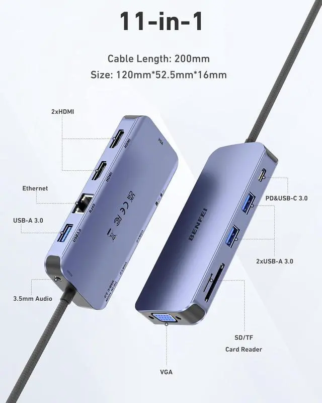 Please pay attention: the supported resolution is up to the output combination please refer to the product description. INCREDIBLE PERFORMANCE - Transfer and backup your files at speeds up to 5Gbps via 3*USB 3.0 ports quick and easy access to photos and other media by SD/TF card reader transfer rates in UHS-I mode up to 160MB/sec charging your computer with power delivery up to 100W. Supports full 10/100/1000Mbps gigabit ethernet performance faster and more reliable than most wireless connections.? To reach 1Gbps make sure to use CAT6 & up Ethernet cables. Design centered on comfort and reliability: Thanks to BENFEI's end-to-end in-house cable production capability in-house PCBA and assembly capability using the industry's most advanced silicone woven design and process 20cm cable in length no knots super-soft the HUB is easy to use in all scenarios: laptop tablet stand etc. Super-soft 25000+ life cycles to meet your daily carrying and office needs. 18 MONTH WARRANTY - Exclusive BENFEI Unconditional 18-month Warranty ensures long-time satisfaction of your purchase; Friendly and easy-to-reach customer service to solve your problems timely.