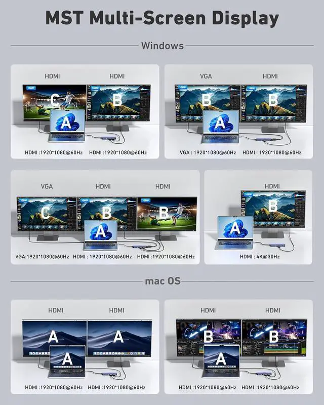 Please note: If you are using a smartphone or iPad with the Hub please plug in the Hub's PD port for charge to ensure enough power for video output function. Otherwise the video output funtion of the Hub may not work or unstable. MultiScreen Solution - With MST feature support BENFEI USB Type-C HUB could support up to 3 maximum screen output 2*HDMI and VGA. The screen could be identical or different depends on your computer setting. The resolutions could be up to 3840*2160@30Hz 1920x1080@60Hz (1080p Full HD) including 720p 1600x1200;